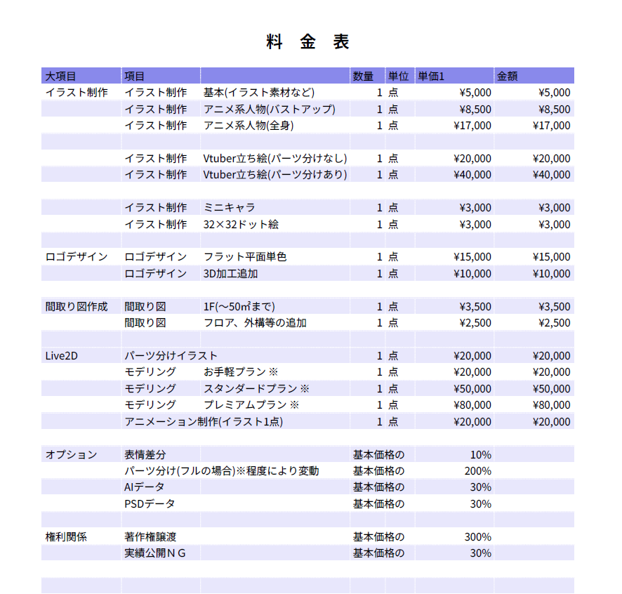 Examples: Additional illustration parts, large-format printing, special deployment, delivery of editable data (AI, PSD, etc.), complex Live2D rigging, etc.